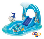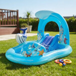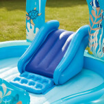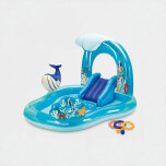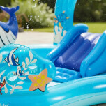 • Desinflado: (2.08 m x 1.88 m) • Inflado: (2.03 m x 1.78 m x 1.27 m) • Diseño de animales marinos • Rociadores de agua incorporados • Incluye un set de juguetes • Se conecta una manguera de jardín estándar • 11 cámaras de aire • Tapón de drenaje • Parche de reparación Edad: 2+